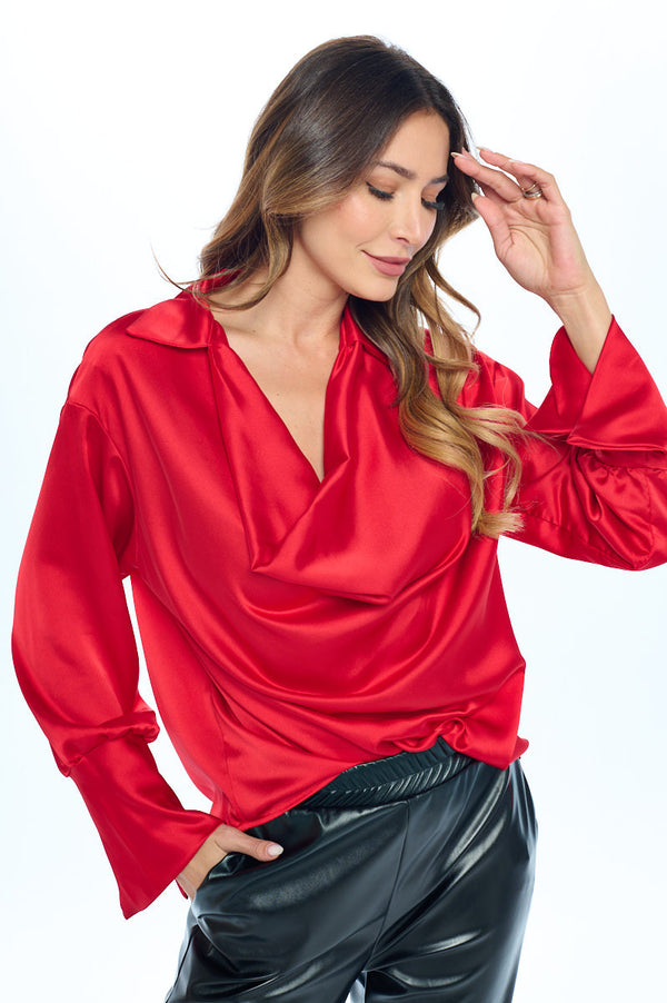 Made in USA Satin Collared Cowl neck Top with Split Cuff. Available in other Colors. Fabric content: 97% Polyester, 3% Spandex. Â