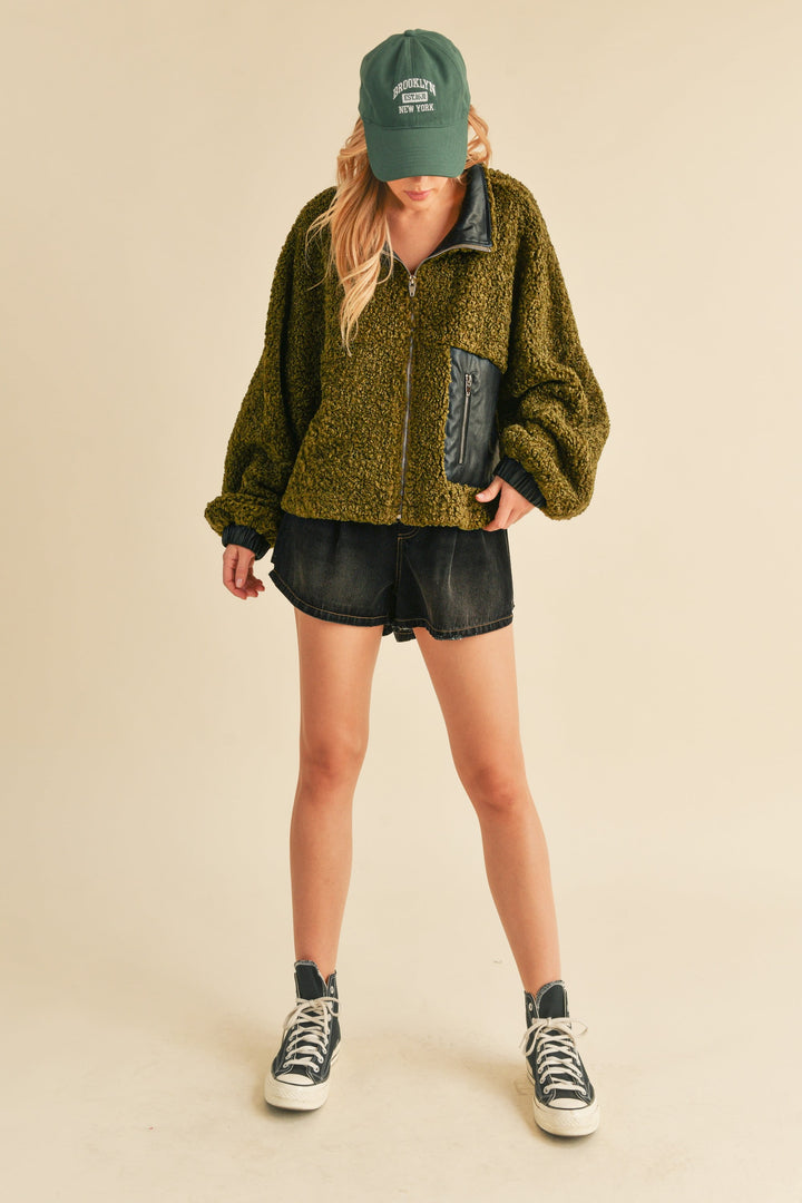 The Collared Neck Zip Up Sherpa Jacket is a cozy and stylish outerwear piece that combines a classic collar neckline with a convenient zip-up closure. The sherpa material provides warmth and comfort, making it ideal for colder weather. This jacket offers a timeless and versatile look that can be dressed up or down. Perfect for layering over tops or sweaters, the collared neck adds a polished touch to your outfit. Pair it with jeans, leggings, or trousers for a chic and practical look during the cooler seasons.