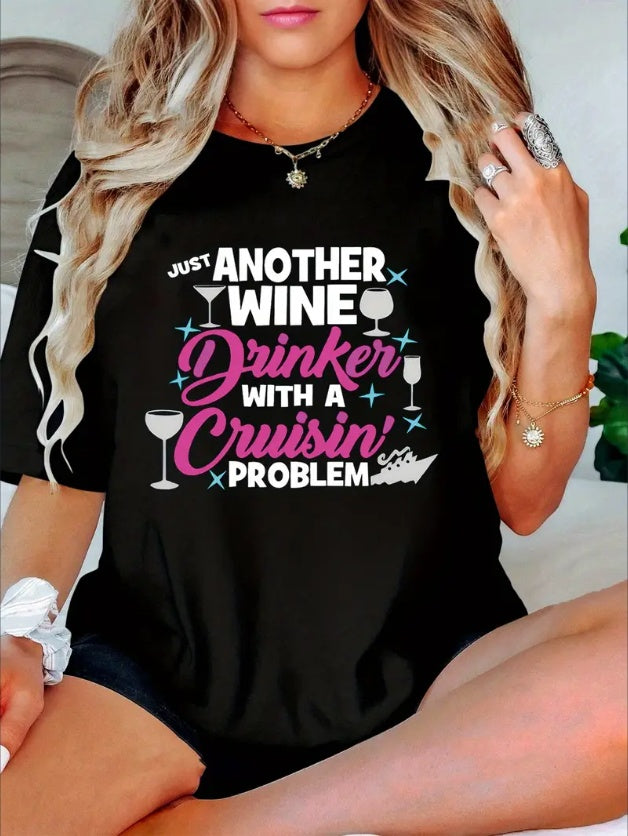Another Wine Drinker Print Tee, Casual Short Sleeve Crew Neck T-shirt, Women'S Clothing