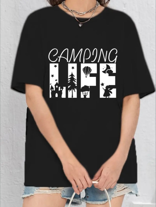 CAMPING LIFE Graphic Print Tee, Teenage Girls' Stylish & Comfy Crew Neck Short Sleeve T-shirt For Spring & Summer, Teenage Girls' Clothes For Everyday Life