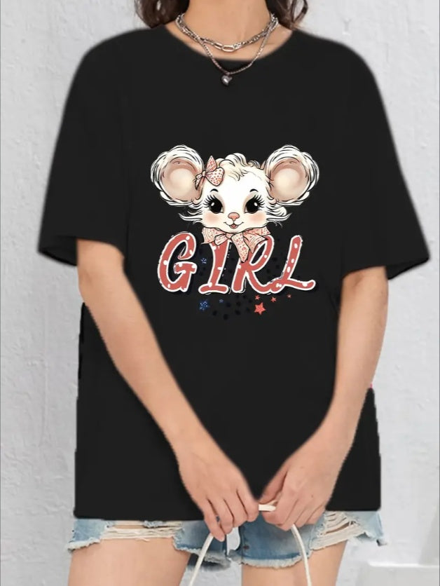 GIRL & Cartoon Mouse Graphic Print Tee, Teenage Girls' Stylish & Comfy Crew Neck Short Sleeve T-shirt For Spring & Summer, Teenage Girls' Clothes For Everyday Life