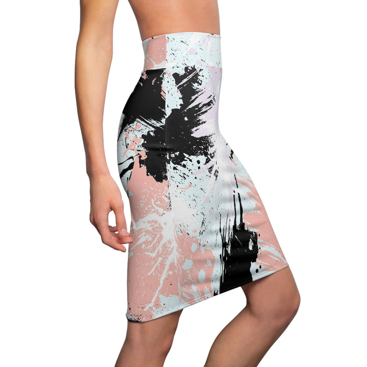 High Waist Womens Pencil Skirt - Contour Stretch - Abstract Pink Black White Paint Splatter Pattern