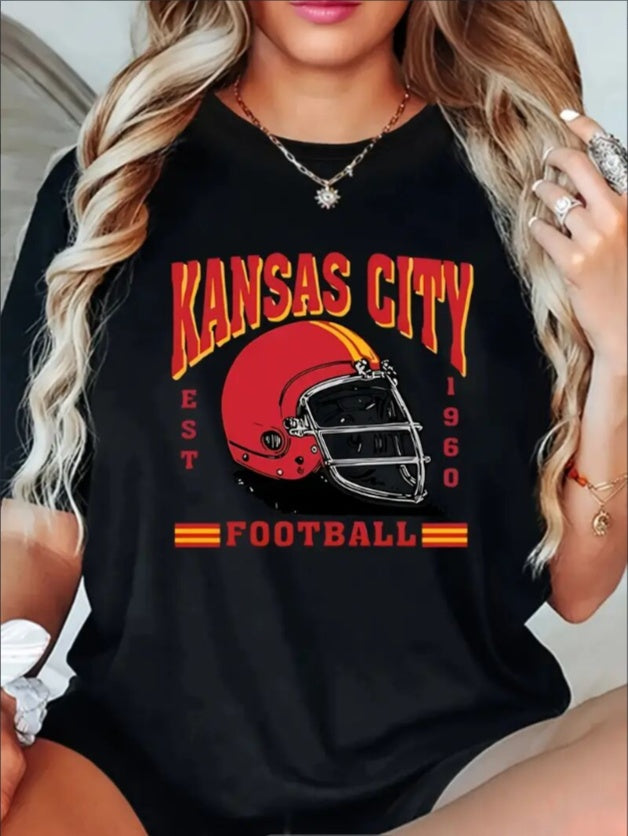 KC, Football Graphic Print T-Shirt - Crew Neck, A Comfortable Women's Short-sleeved Crew Neck T-shirt For Everyday Wear And Stylish Layering