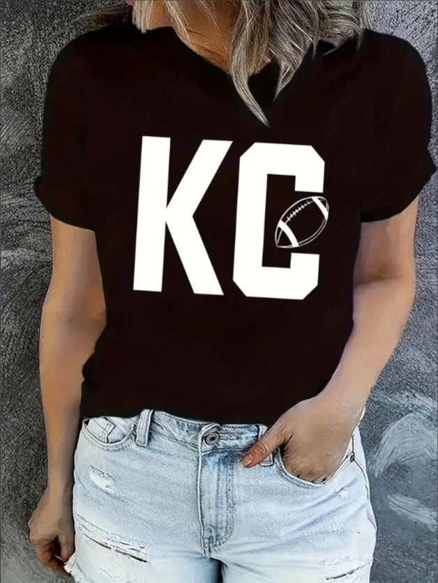 KC, Football Graphic Print T-Shirt - Crew Neck, A Comfortable Women's Short-sleeved Crew Neck T-shirt For Everyday Wear And Stylish Layering