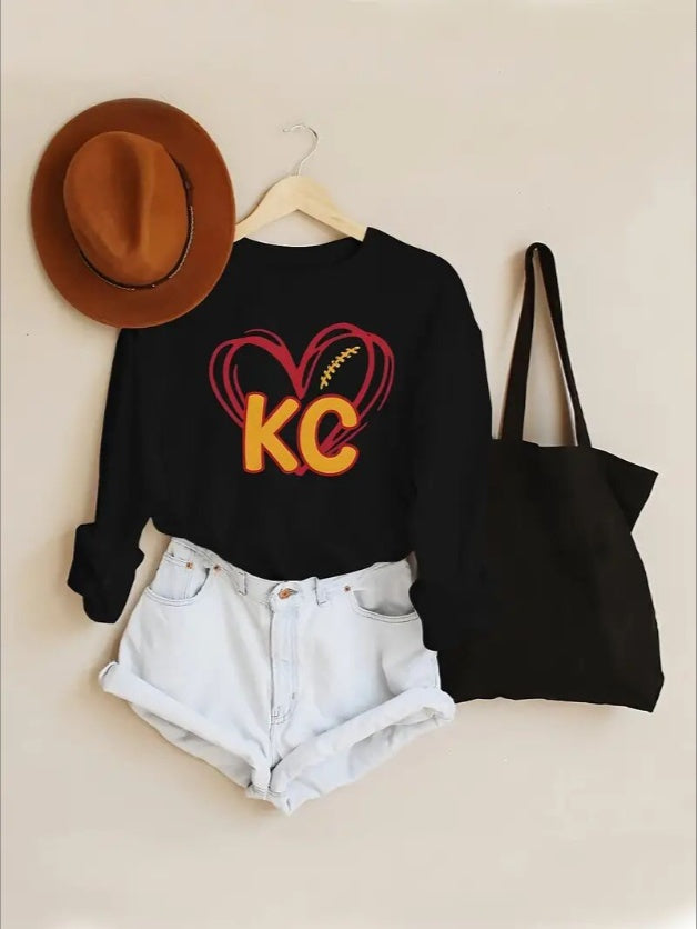 KC, Football Graphic Print T-Shirt - Crew Neck, A Comfortable Women's Short-sleeved Crew Neck T-shirt For Everyday Wear And Stylish Layering
