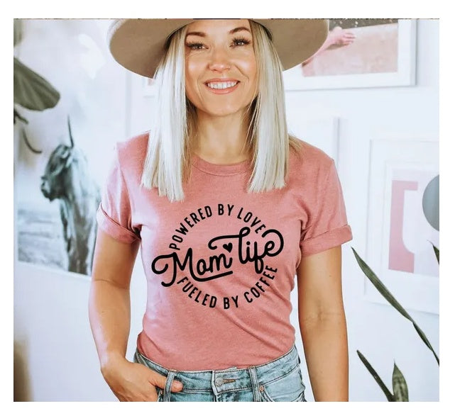 Mom Life Powered By Love Fueled By Coffee T-Shirt, Coffee Lover Shirt, Mama Life Shirt, Caffiene Tee, Mother's Day Shirt, Mom Gift Tee