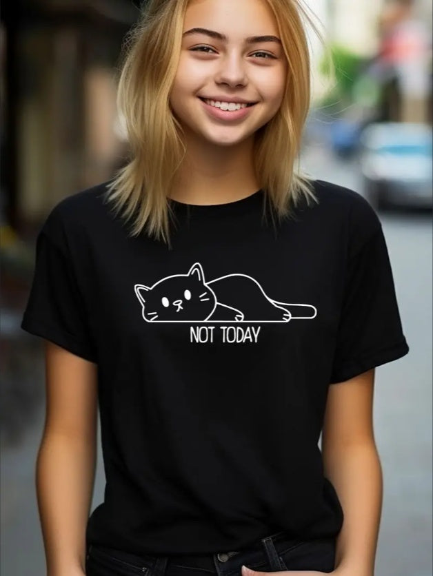 Not Today Cat Print Girls' T-Shirt - Casual Short Sleeve, Crew Neck Top For Teens - Perfect For Spring Summer