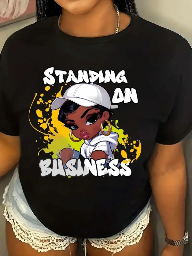 Plus Size Cartoon Black Girl Letter Printed T-Shirt, Women's Fashion Casual Short Sleeve Round Neck Comfortable Top