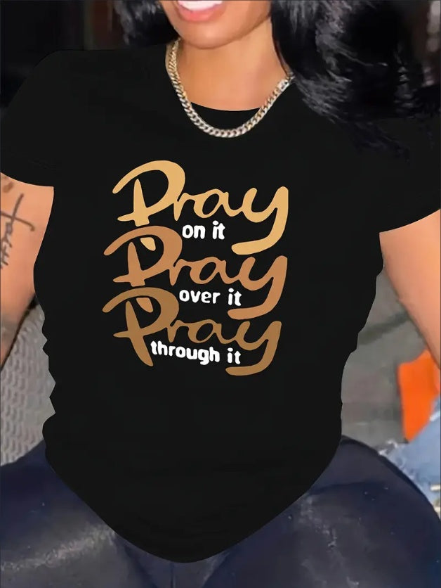 Pray Letter Print T-shirt, Short Sleeve Crew Neck Casual Top For Summer & Spring, Women's Clothing