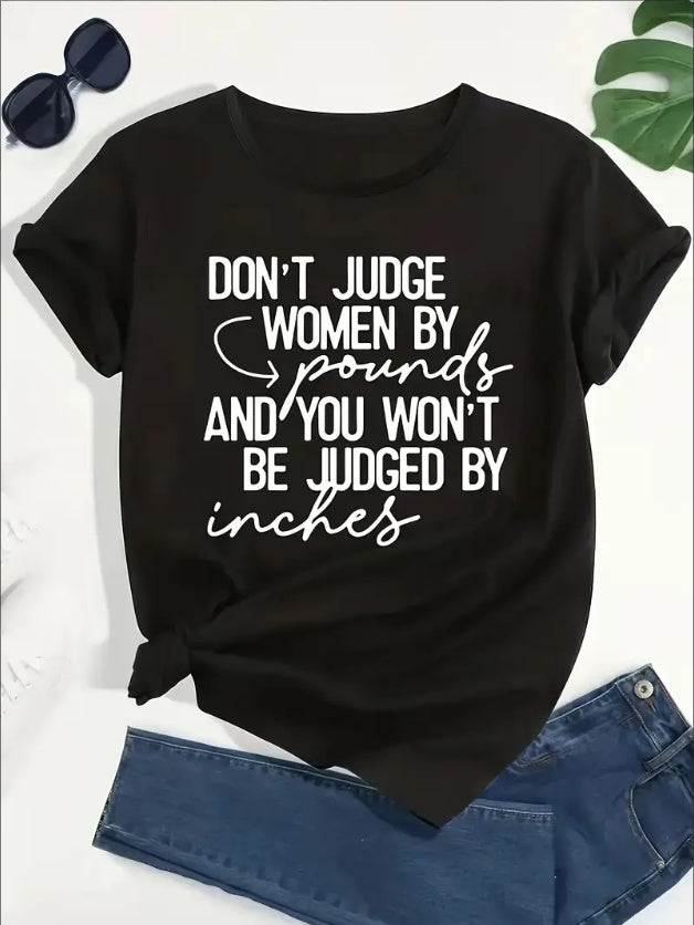 Spring Summer Graphic Tees Funny Letter Print Don't Judge Women By Pounds And You Won't Judged By Inches Casual Crew Neck Short Sleeve T-shirt