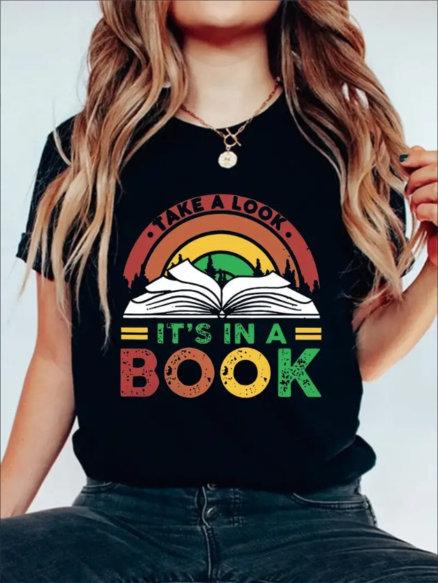 Take A Book Graphic Print Solid T-Shirt, Crew Neck Short Sleeve Casual Top For Summer & Spring, Women's Clothing