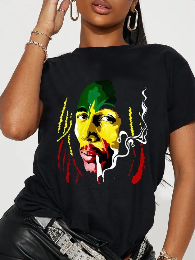 Vibrant Graphic Print Crew Neck T-Shirt - Soft Micro Elasticity, Portrait Pattern, Regular Length, Summer Essential - Casual Short Sleeve Top For Women