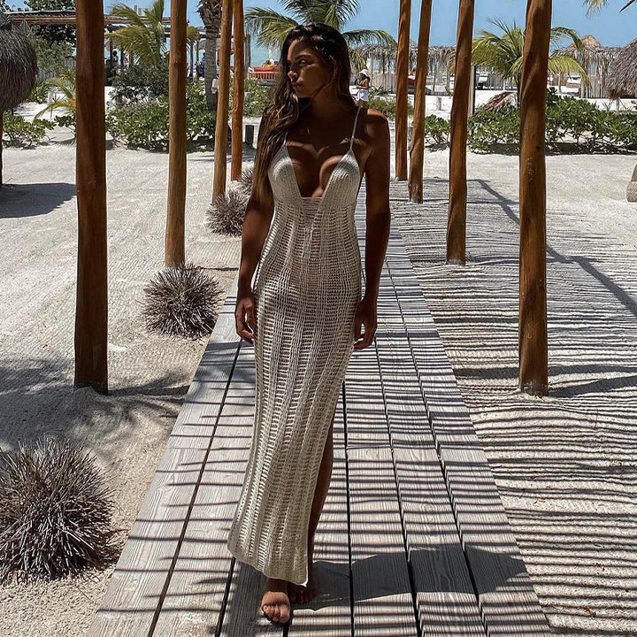 Women Sling Backless Knitted Dress Beach Seaside V neck Sexy Tight Split Spring Summer Dress