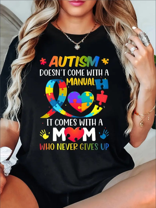 Women'S Casual Crew Neck T-Shirt With Autism Awareness Cartoon Print - Soft Polyester Knit Fabric, Short Sleeve Regular Length Top For All Seasons