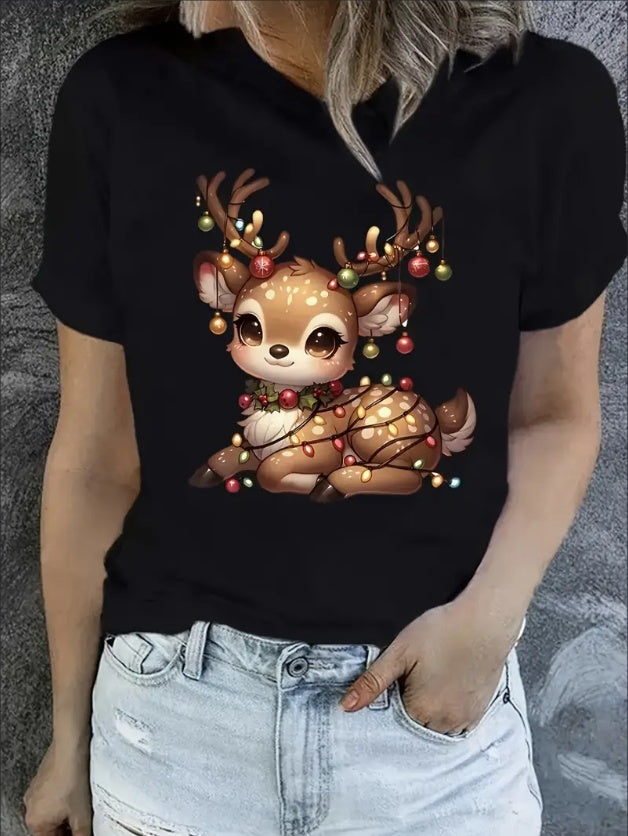 Women's Christmas Print Crew Neck T-Shirt - Casual Short Sleeve Top, Machine Washable For Spring & Summer, Machine Washable