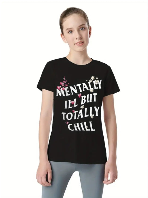 Youth Mentally Ill But Totally Chill Graphic Tee, Crew Neck T-Shirt, Casual Sports Style, Cartoon Print, Regular Fit, For Teens, Summer Knit Top